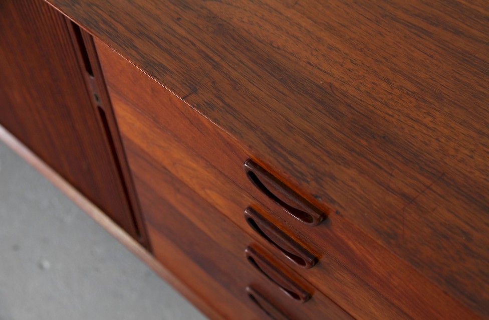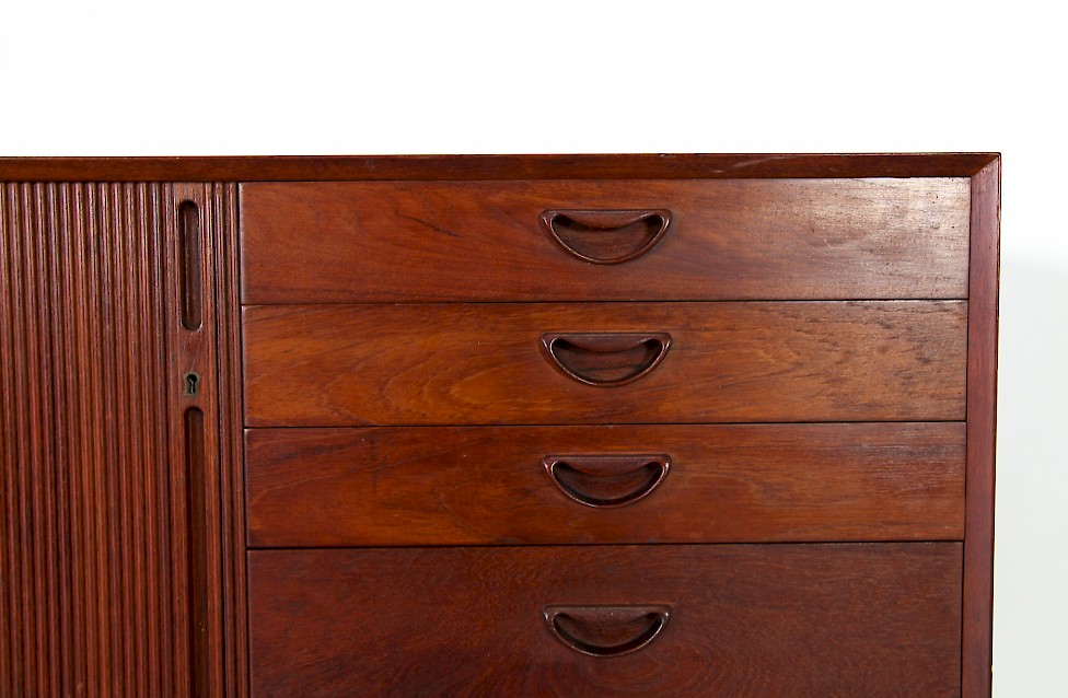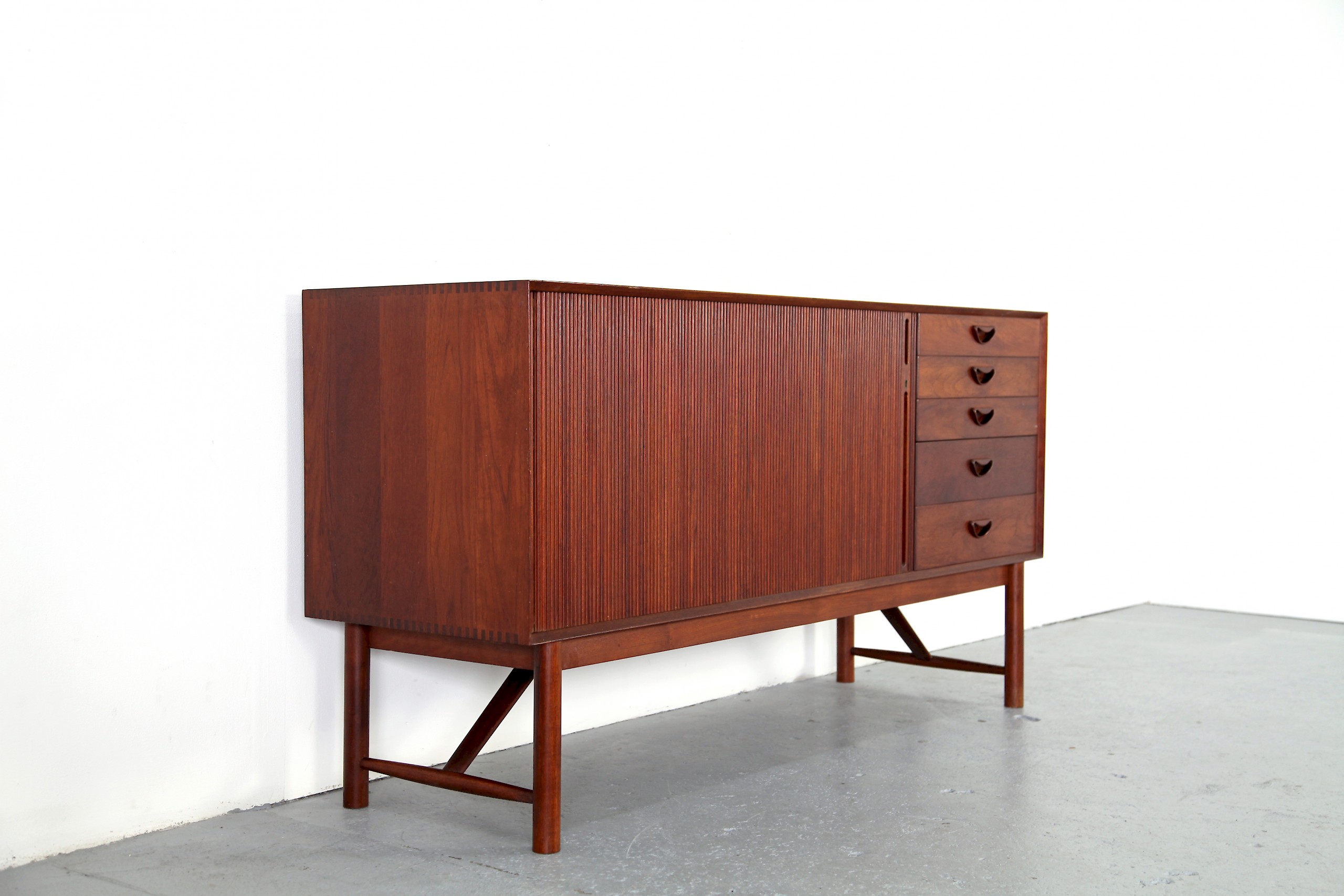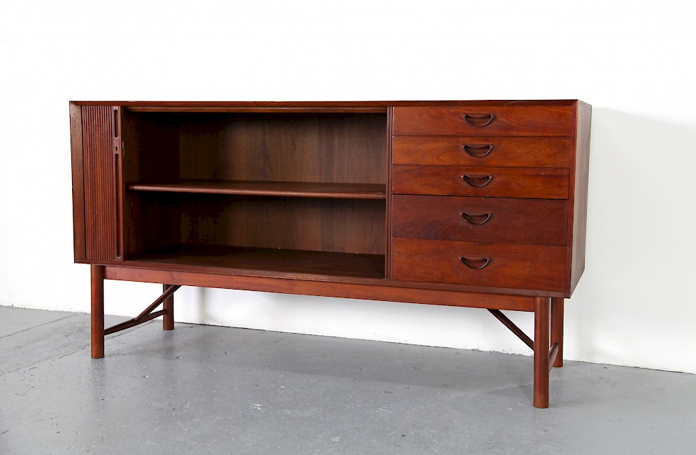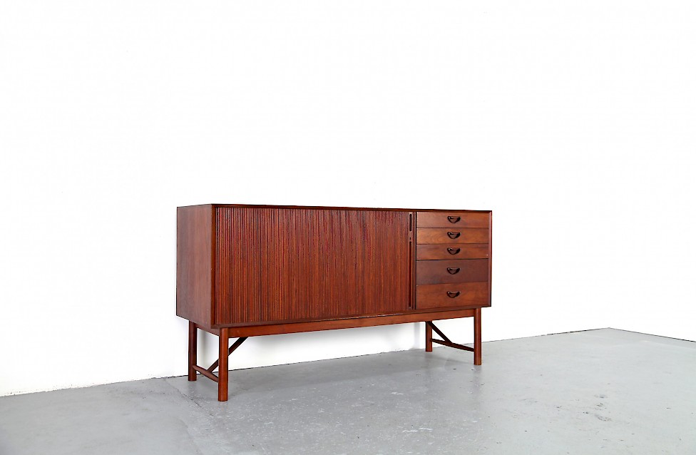 Hochwertiges Sideboard, entworfen von dem dänischen Designer-Duo Peter Hvidt & Orla Molgaard Nielsen. Edler Teakholz-Korpus mit Jalosientür und rechts angeordneten Schubladen. Großartiger Entwurf und Verarbeitung. Die Anrichte ist in einem hervorragenden Zustand mit wenigen Gebrauchsspuren.