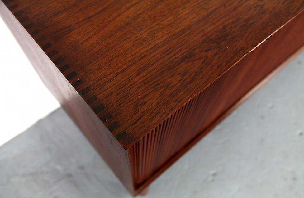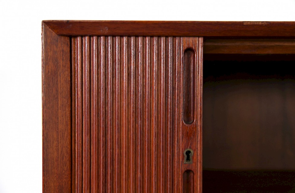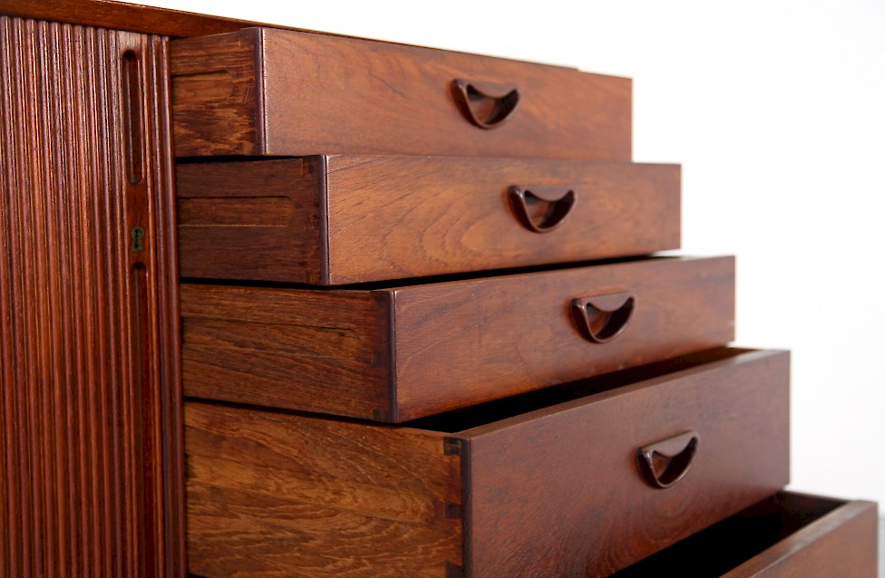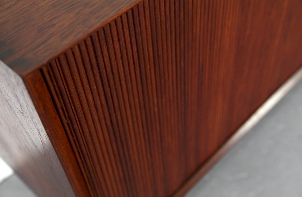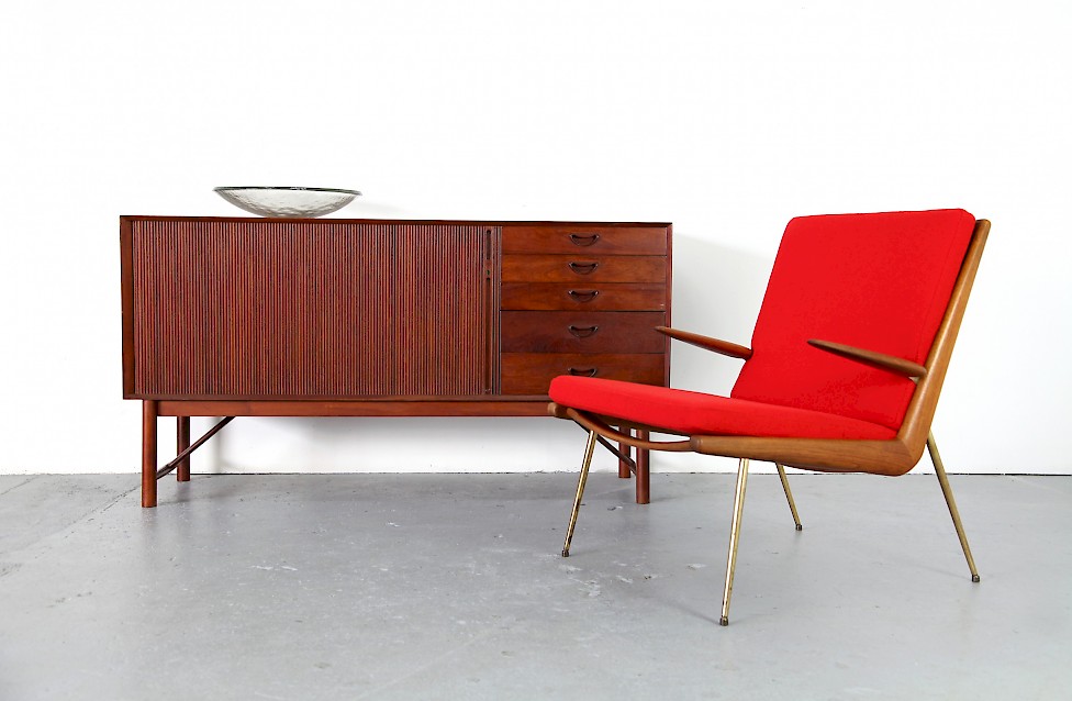 Hochwertiges Sideboard, entworfen von dem dänischen Designer-Duo Peter Hvidt & Orla Molgaard Nielsen. Edler Teakholz-Korpus mit Jalosientür und rechts angeordneten Schubladen. Großartiger Entwurf und Verarbeitung. Die Anrichte ist in einem hervorragenden Zustand mit wenigen Gebrauchsspuren.