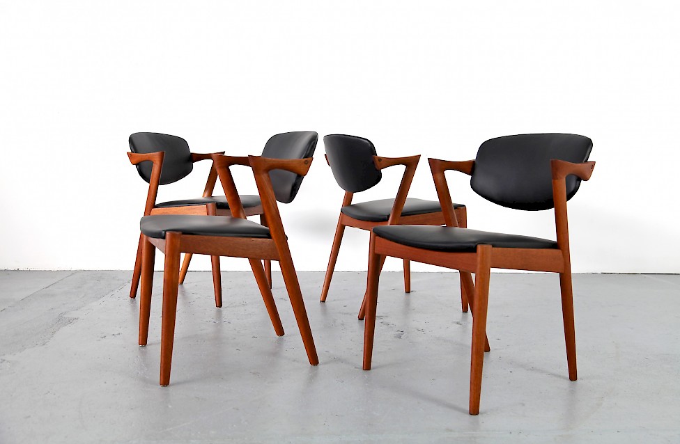 Sehr schönes Stuhlset aus Teakholz bestehend aus vier exklusiven Stühlen, entworfen von Kai Kristiansen. Die Stühle sind neu aufgepolstert und mit einem hochwertigen schwarzen Echtleder neu bezogen worden. Alle Stühle sind in sehr guten Zustand mit leichten altersgerechten Gebrauchsspuren.