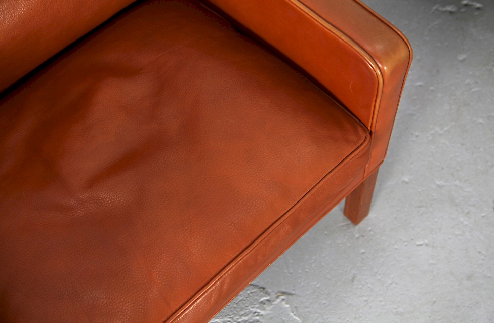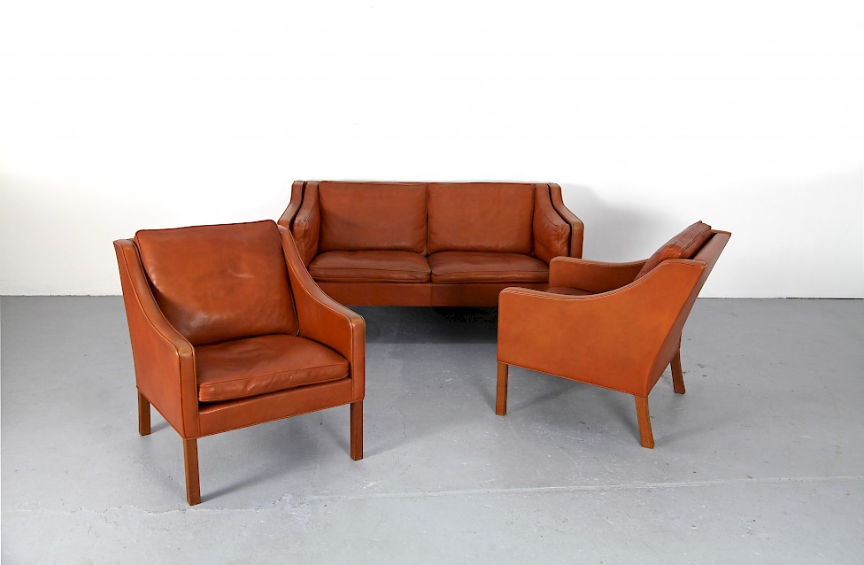 Designklassiker Modell 2207 von Børge Mogensen für Fredericia. Zwei Sessel bezogen mit rost-braunem Echtleder und Teakholz Beinen. Sitz -und Rückenkissen sind mit Daunen gefüllt. Auf der Unterseite gelabelt. In unseren Angeboten finden SIe auch das passende Zweisitzer-Sofa. Sehr guter Gebrauchszustand, mit schöner Patina.