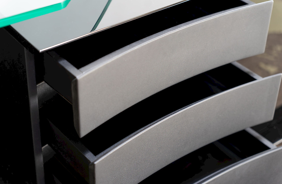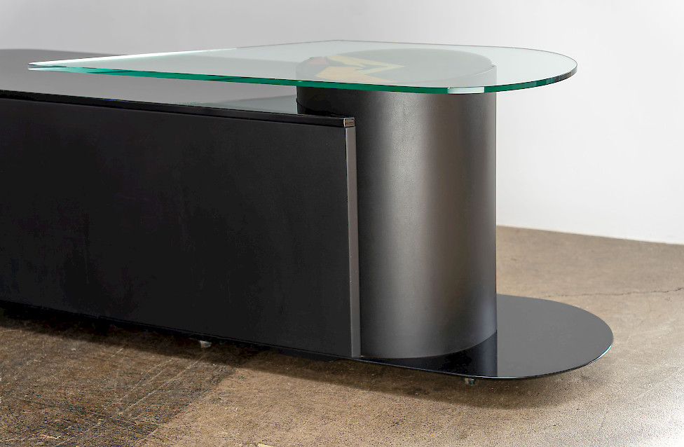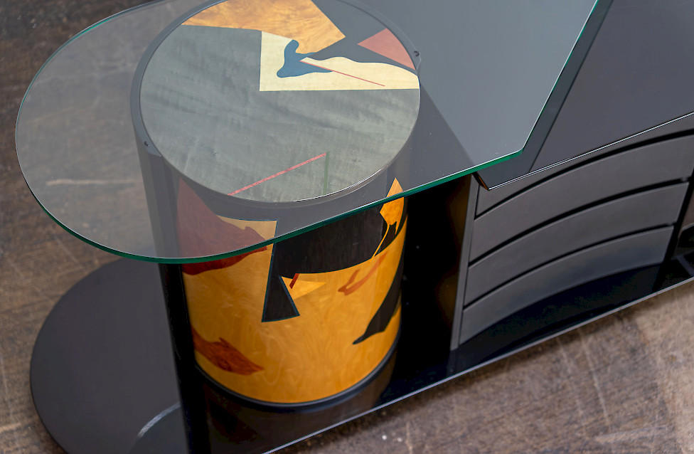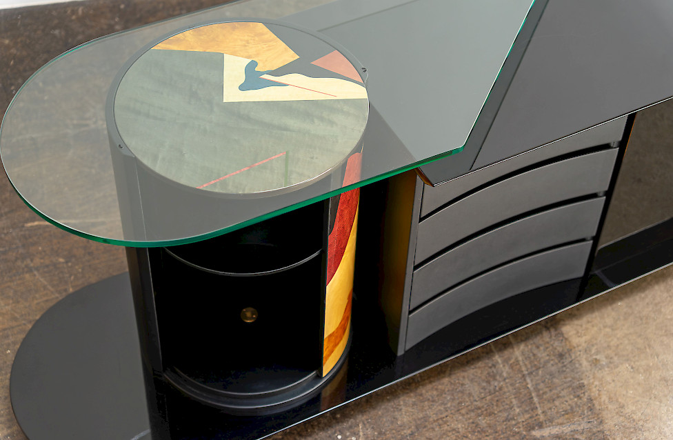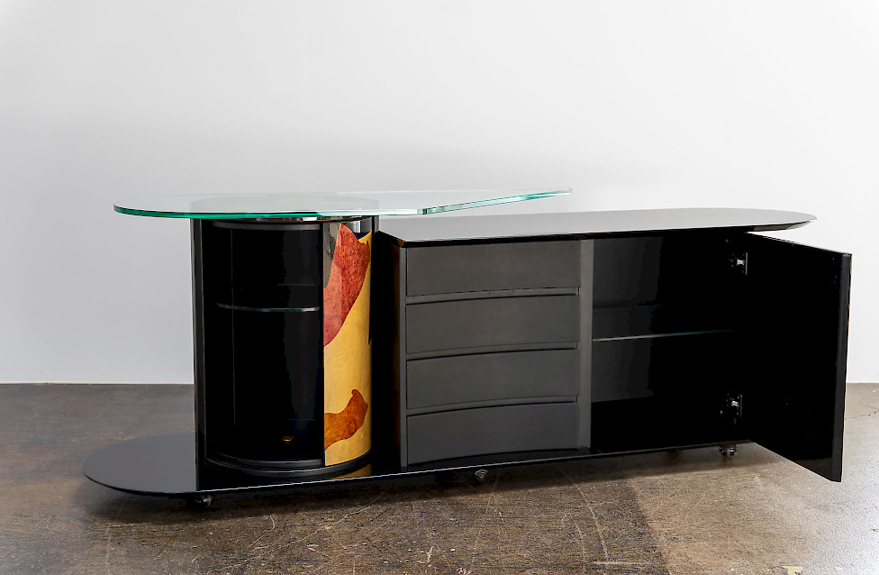 Dieses außergewöhnliche Sideboard von Carlo Malnati ist ein seltenes, signiertes Stück aus den späten 1980er/1990er Jahren und verfügt über eine drehbare Zylindertür mit handgefertigter Marketerie. Die hochglänzende schwarze Lackierung, die skulpturale Form und die geformte Glasplatte verleihen dem Möbel seine charakteristische italienische Präsenz. Die Rückseite ist vollständig ausgearbeitet, sodass das Stück frei im Raum platziert werden kann. Vier filzgefütterte Schubladen und ein Fach mit Glasablage bieten elegante Aufbewahrung. Dank unauffälliger Rollen lässt es sich trotz seiner Größe leicht bewegen.