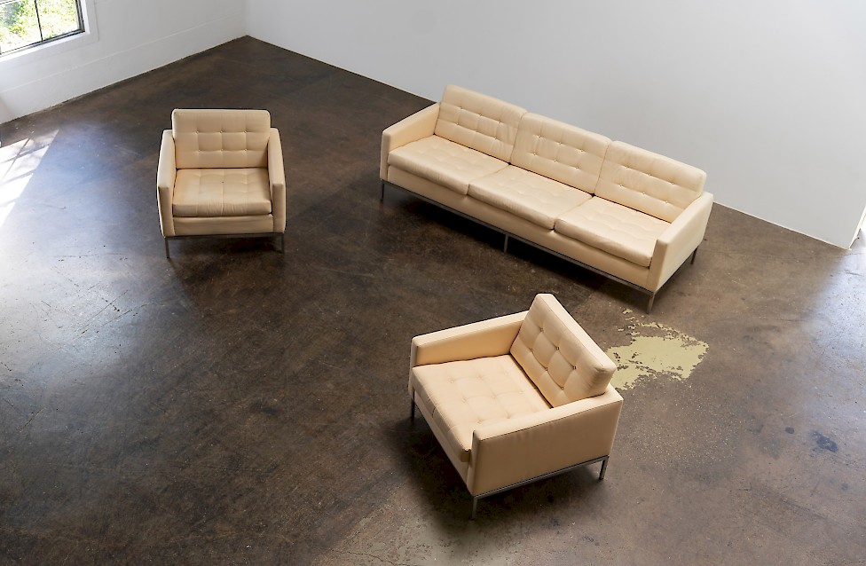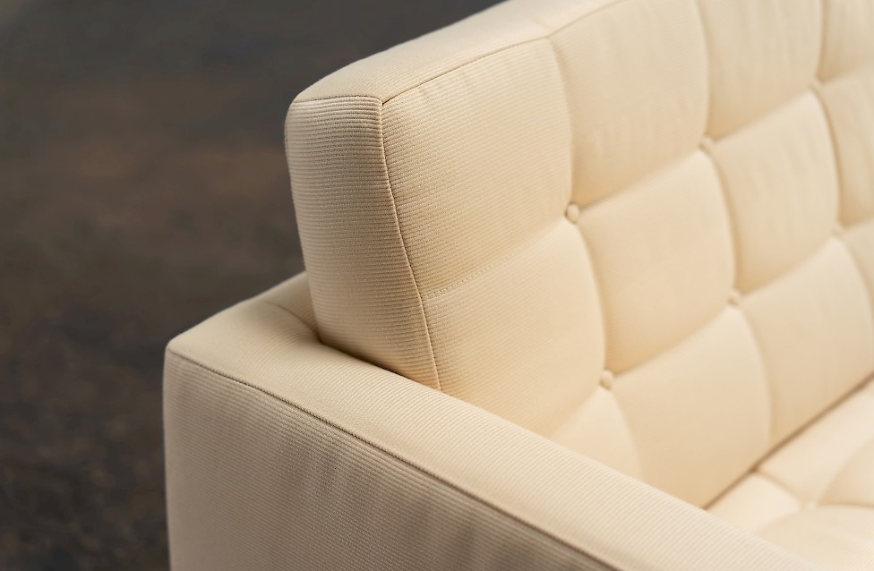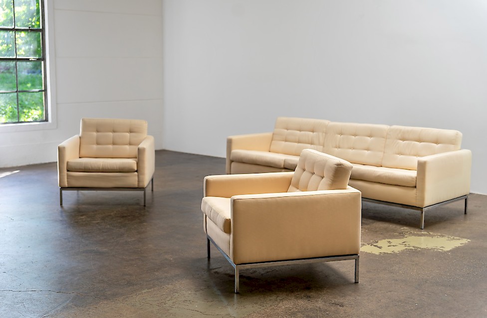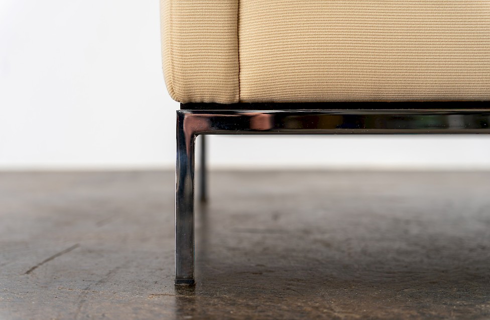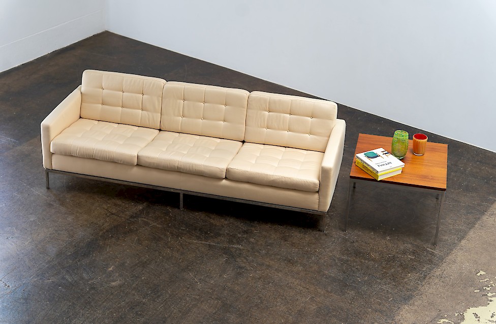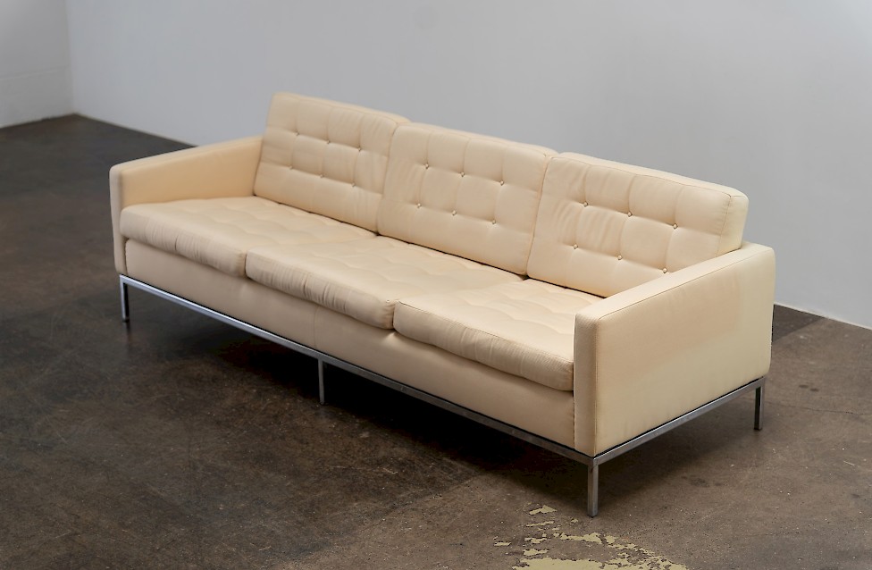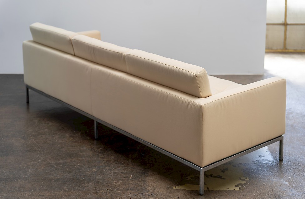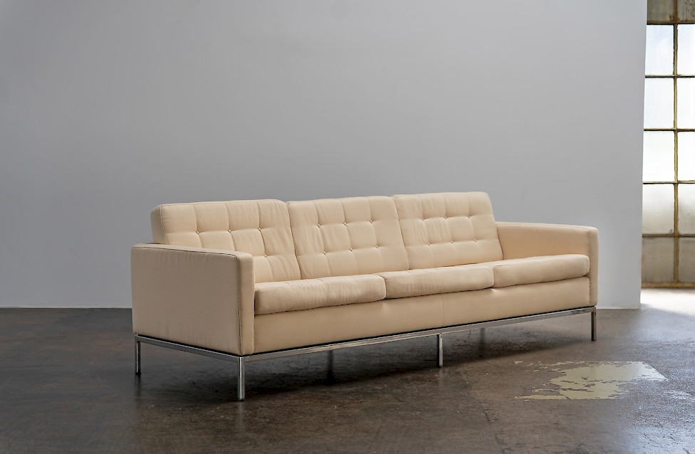 Vintage Sofa von Florence Knoll, entworfen 1954 für Knoll International – ein Klassiker des modernen Möbeldesigns und Inbegriff architektonischer Eleganz. Das Modell überzeugt mit klarer Linienführung, ausgewogenen Proportionen und zeitloser Präsenz. Das Polster wurde vor etwa 15 Jahren fachgerecht erneuert und ist in exzellentem Zustand. Der aktuelle Bezug ist ein hochwertiger, seidiger Polsterstoff, der dem Charakter des Originals stilvoll gerecht wird. Auf Wunsch kann das Sofa gegen Aufpreis neu bezogen werden.