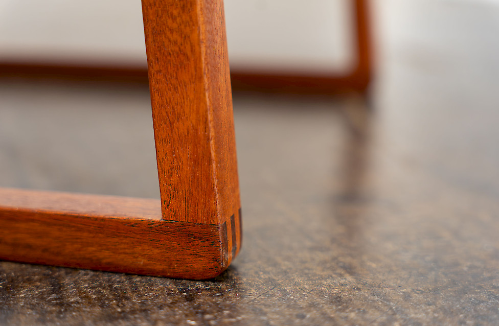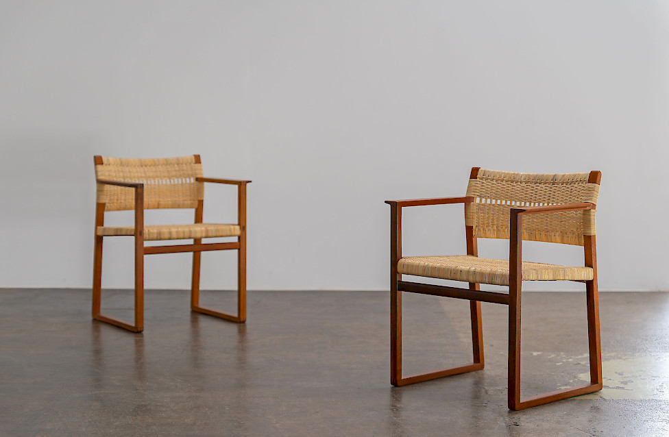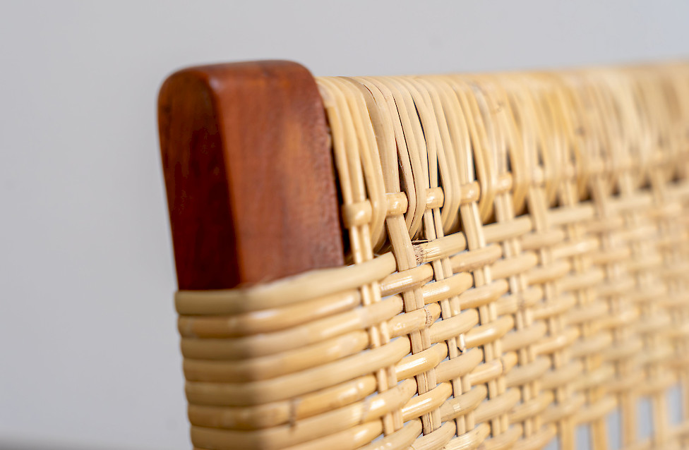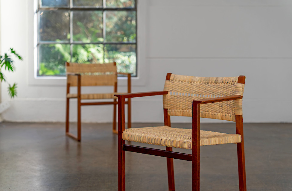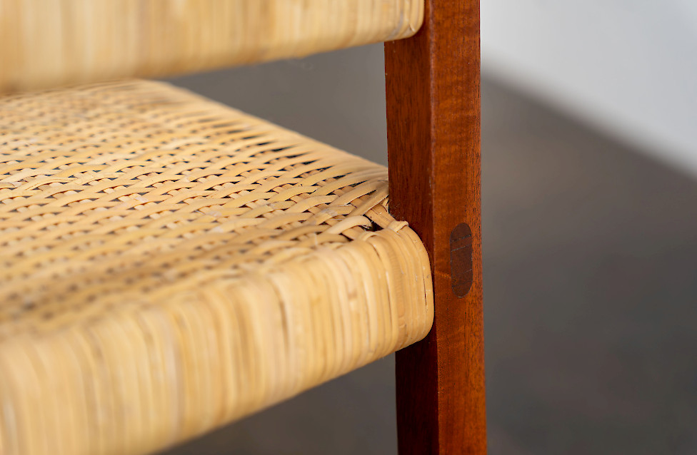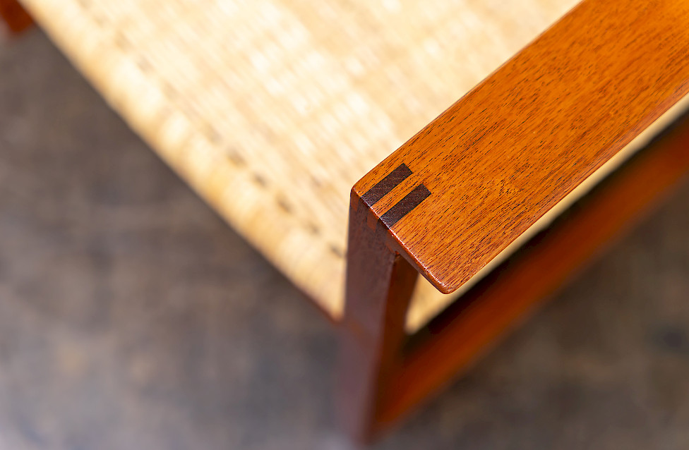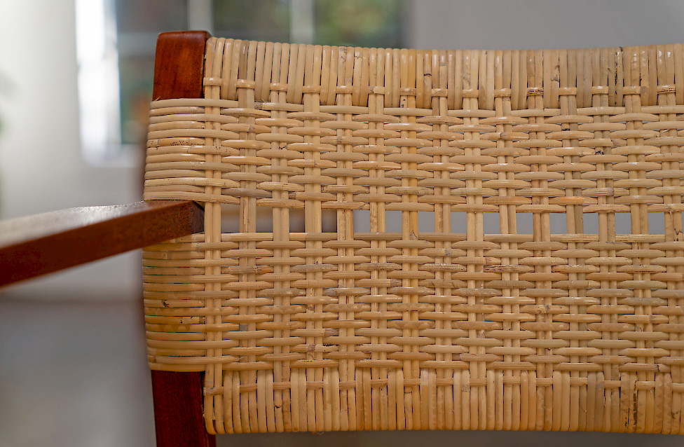 Die massiven Mahagonirahmen zeigen präzise Holzverbindungen und weich gerundete Kanten, die Mogensens Anspruch an ehrliche, langlebige Materialien widerspiegeln. Sitz und Rückenlehne wurden fachgerecht neu mit hochwertigem Naturgeflecht bezogen, in enger Anlehnung an die originale Ausführung und mit besonderem Augenmerk auf Langlebigkeit und authentische Optik.