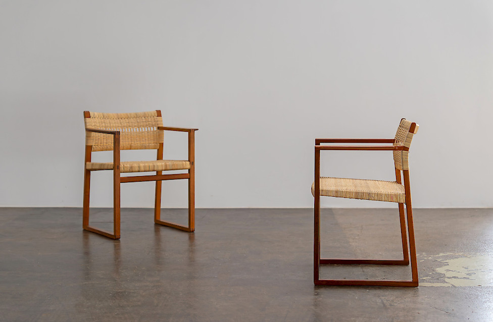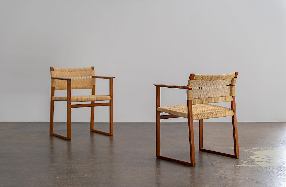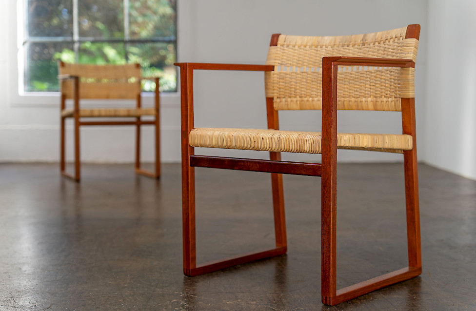 Dieses außergewöhnliche Paar BM62-Armlehnstühle gehört zu den ausgereiftesten Entwürfen von Børge Mogensen und liegt hier in einer seltenen Mahagoni-Variante vor. Während das Modell üblicherweise in Eiche bekannt ist, zeichnen sich diese Exemplare durch ihren warmen Ton, die schöne Maserung und die besonders hohe Verarbeitungsqualität früher Kleinserien aus.