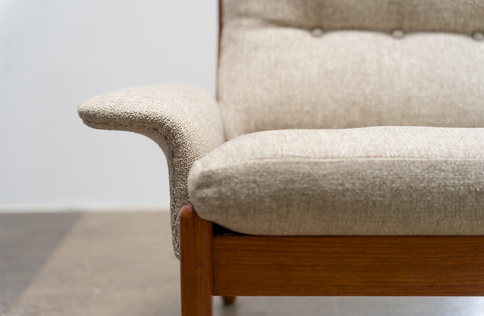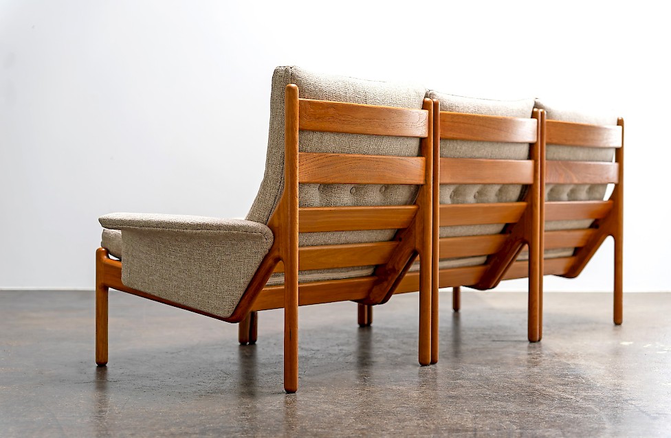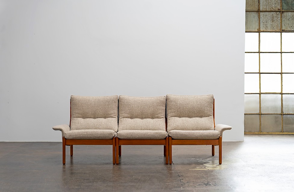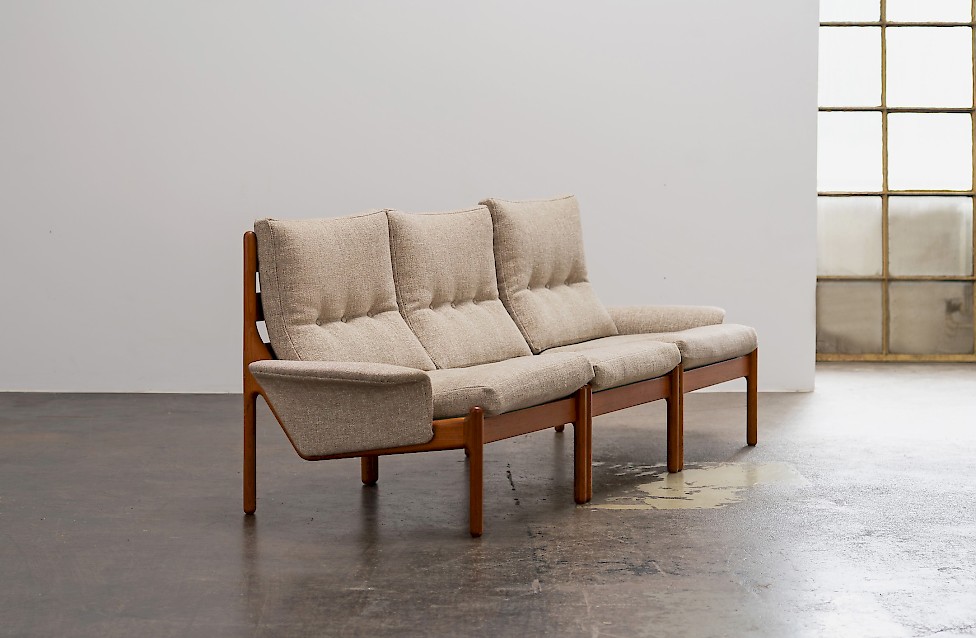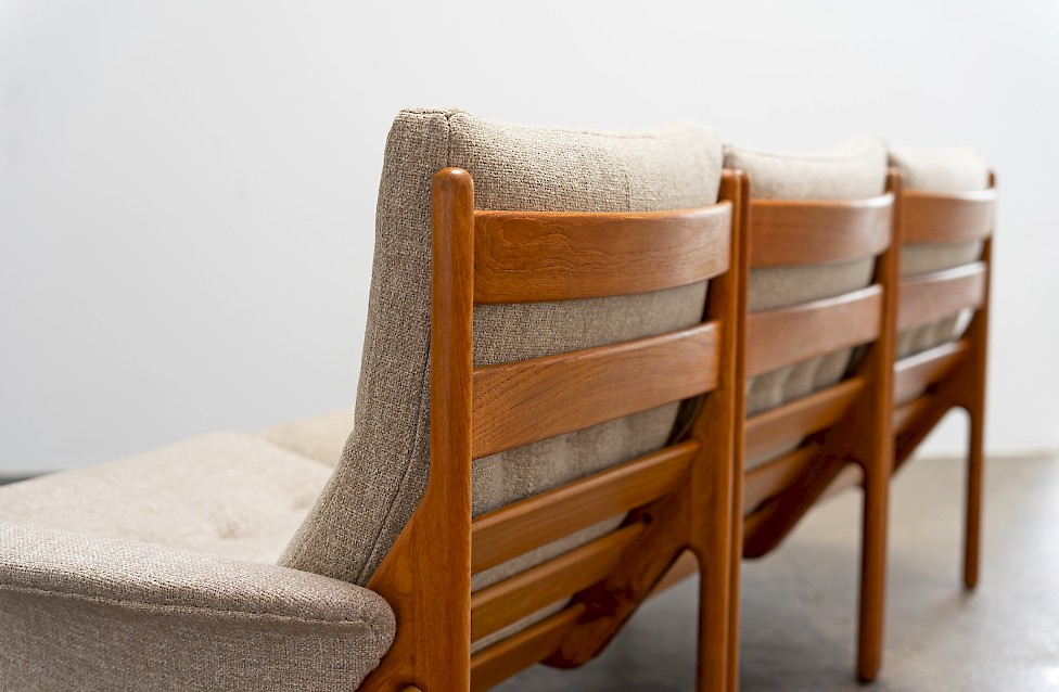 Sofa entworfen von Illum Wikkelsø für Silkeborg, Baujahr 1972. Massives Teakholz, mit geschwungenem Gestell. Dänisches Design aus den 1970er Jahren mit hochwertiger Verarbeitung.
