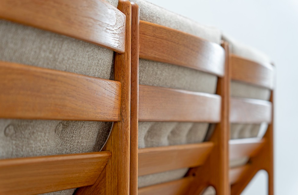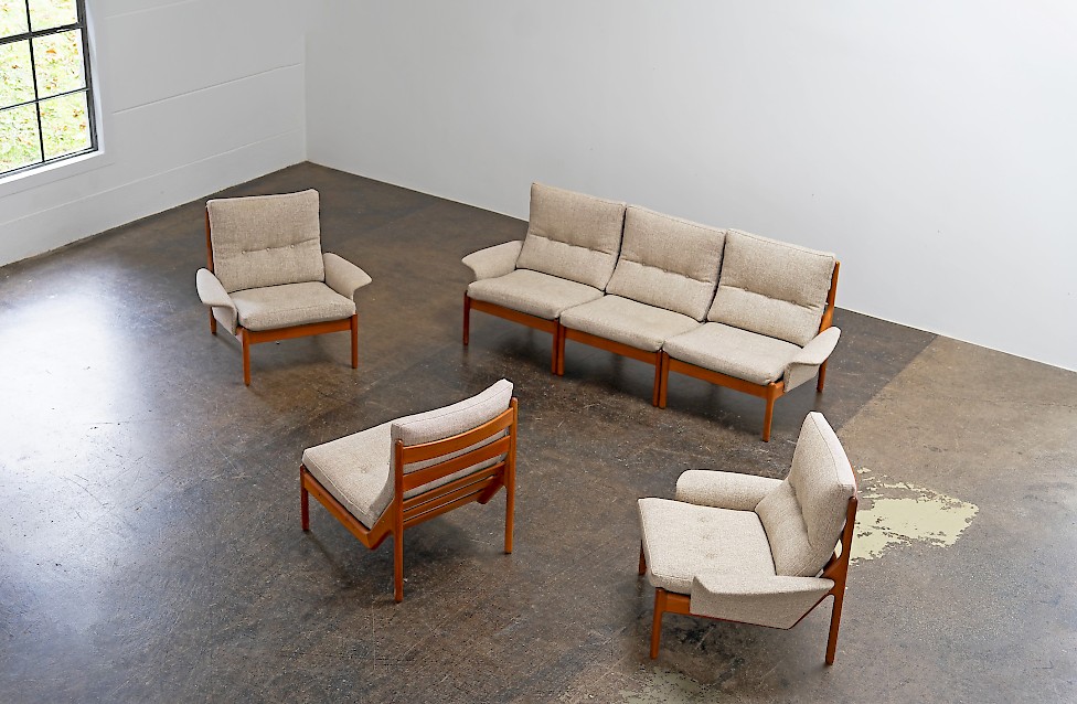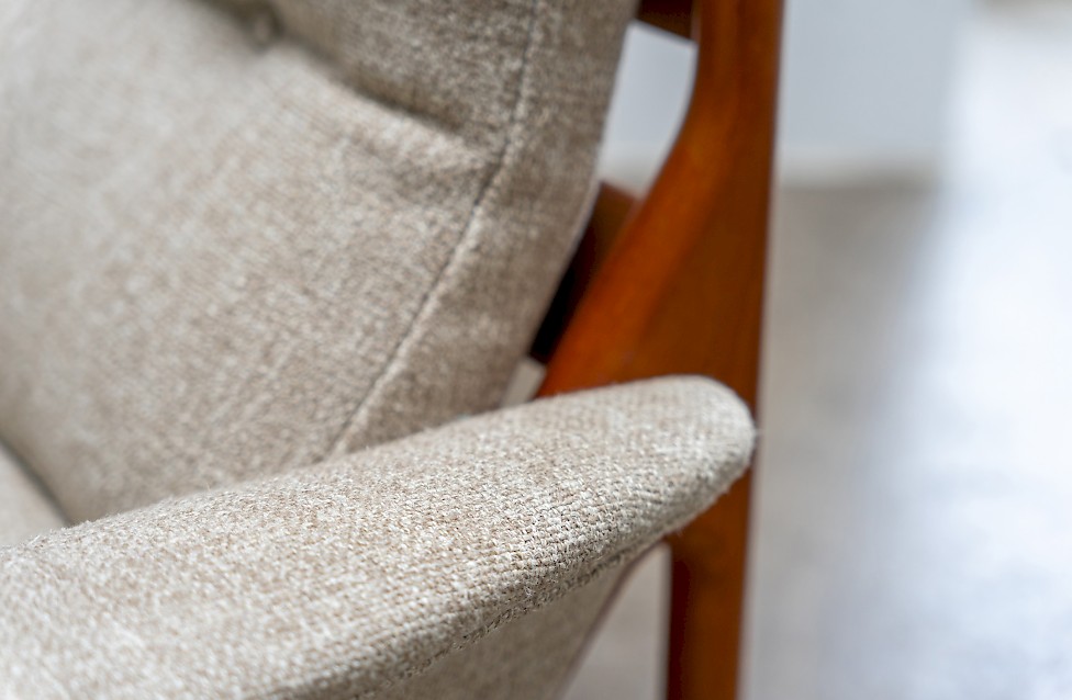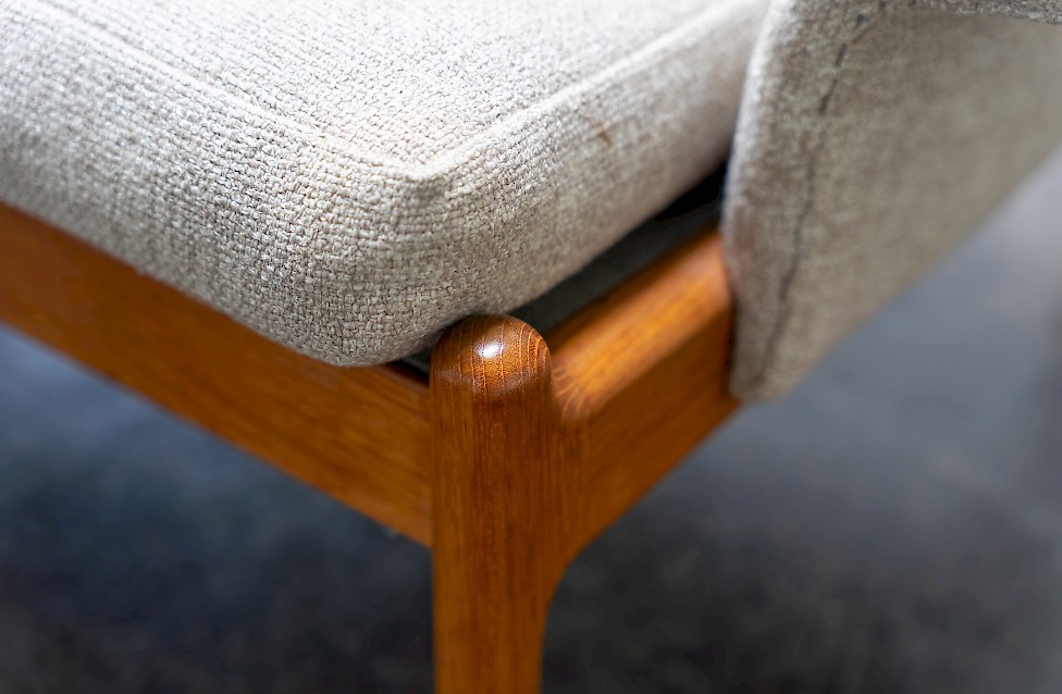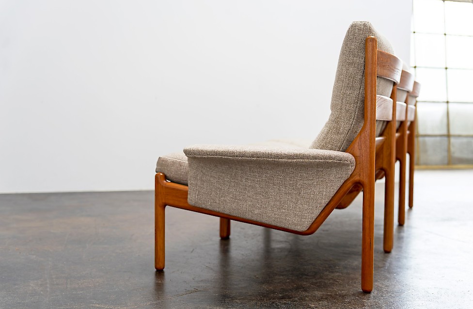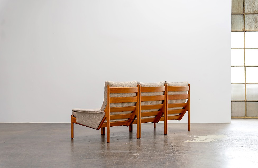 Sofa entworfen von Illum Wikkelsø für Silkeborg, Baujahr 1972. Massives Teakholz, mit geschwungenem Gestell. Dänisches Design aus den 1970er Jahren mit hochwertiger Verarbeitung.