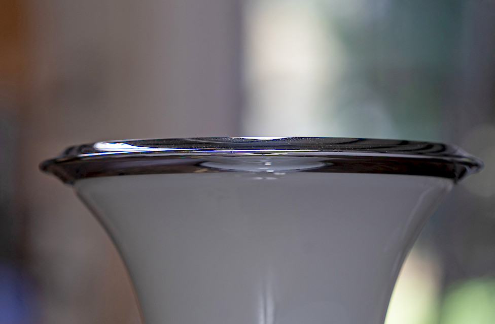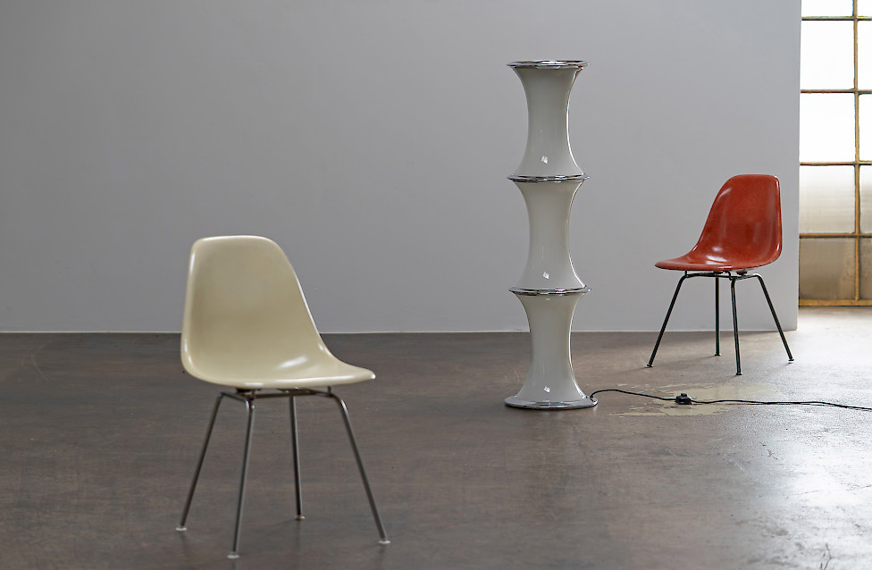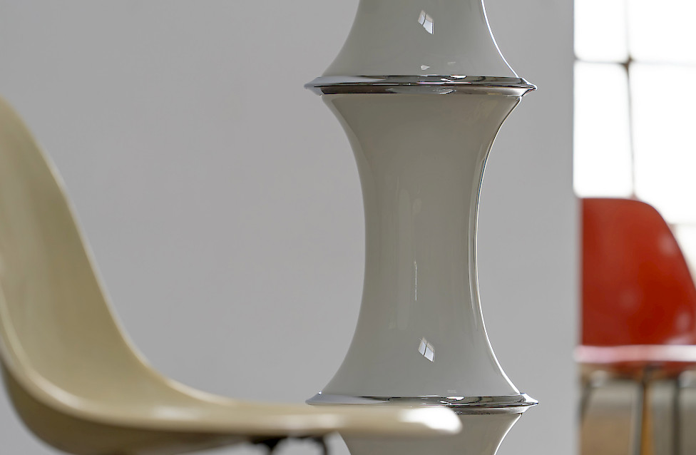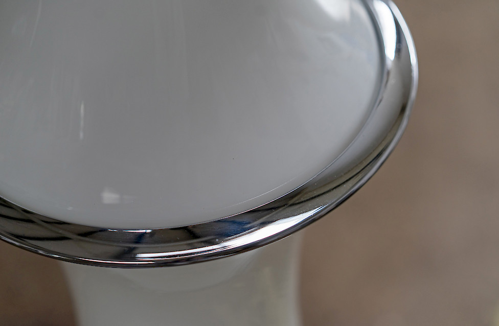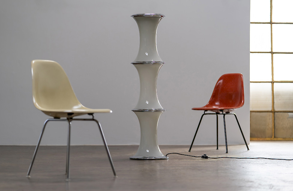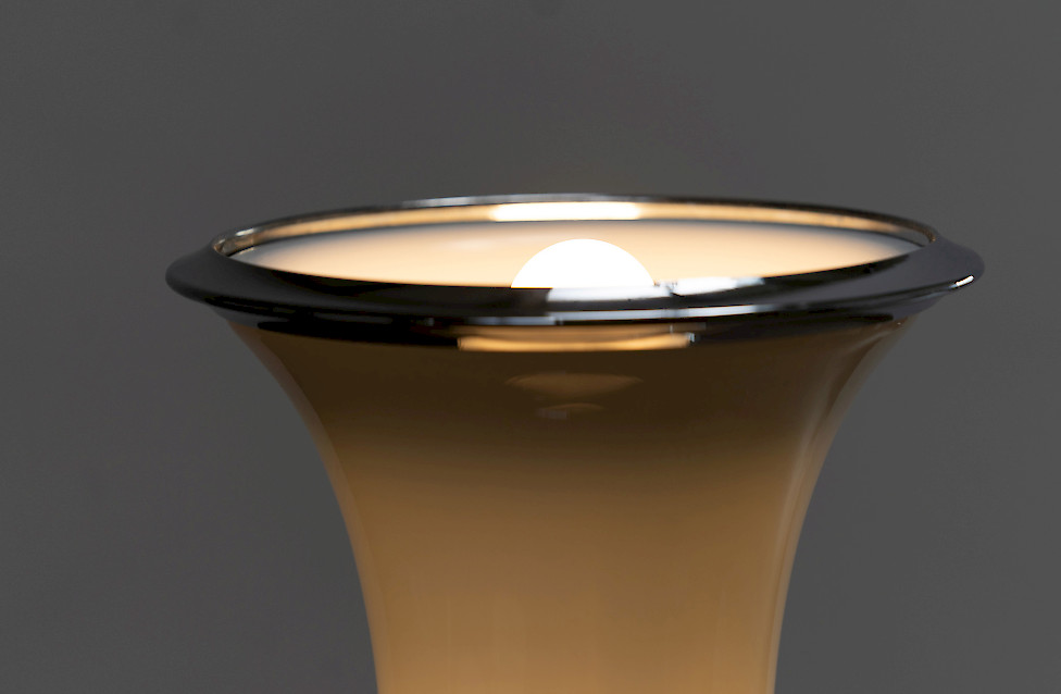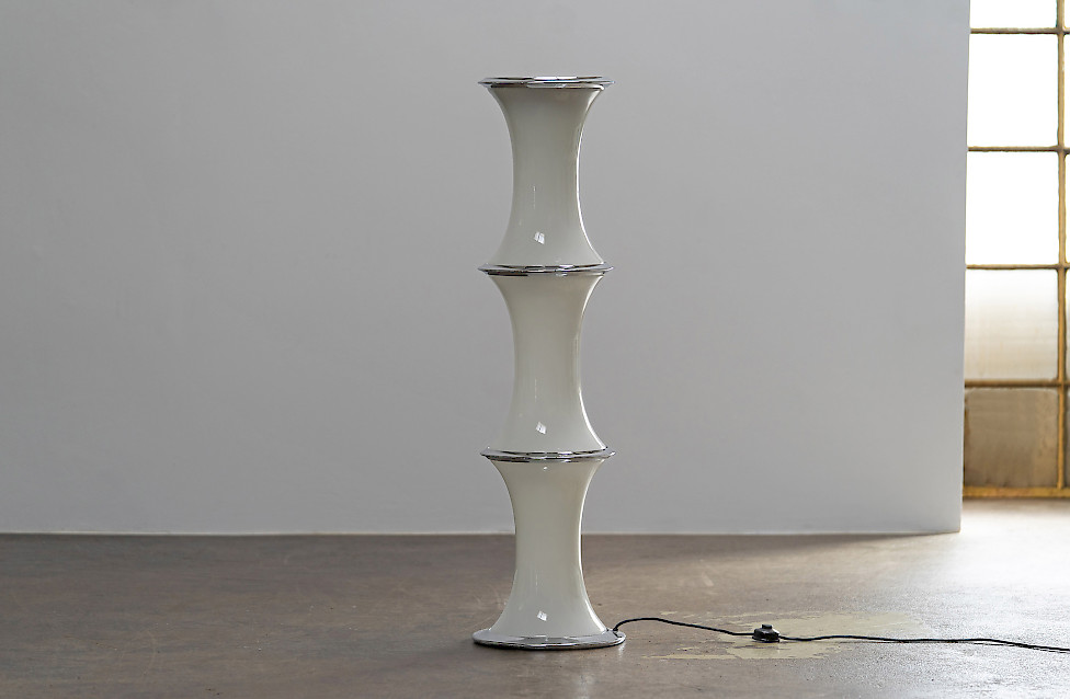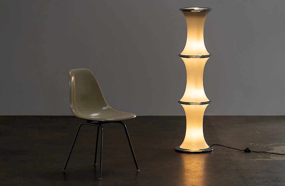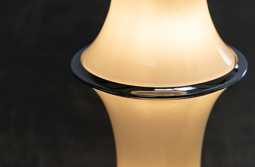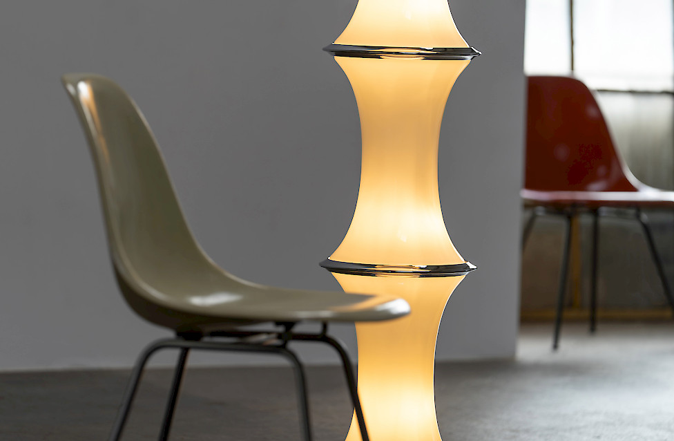 The lamp consists of three stacked textured glass elements whose shape resembles bamboo segments. Each glass section contains two light sources, while the top functions as an uplighter. The ribbed Murano glass produces a beautiful play of light and shadow. The lamp has three lighting settings operated by a floor switch.