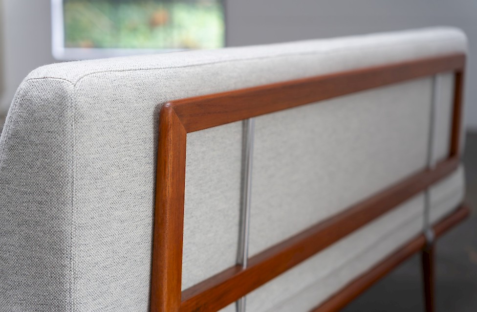 Sofa daybed from the 1960s by France and Søn made of teakwood. This piece is featuring two cushioned armrests. The piece has been restored and covered with a light grey fabric "Hallingdal" by Kvadrat.