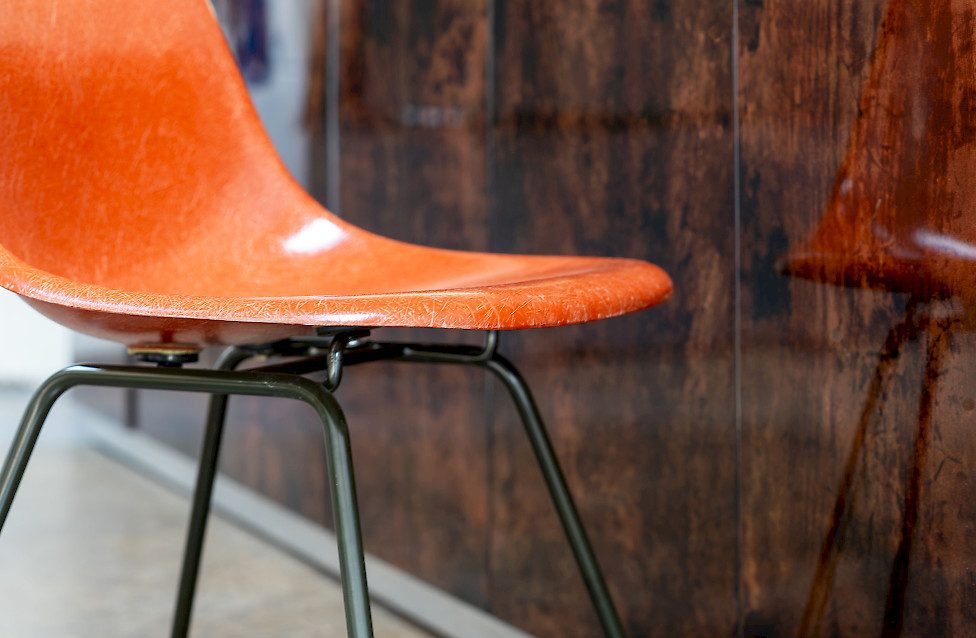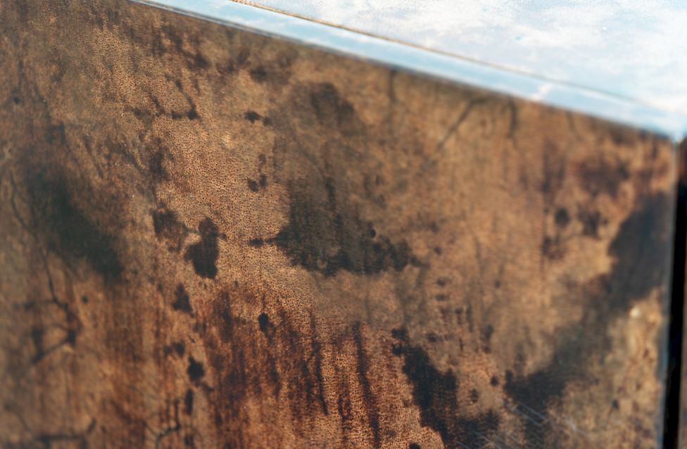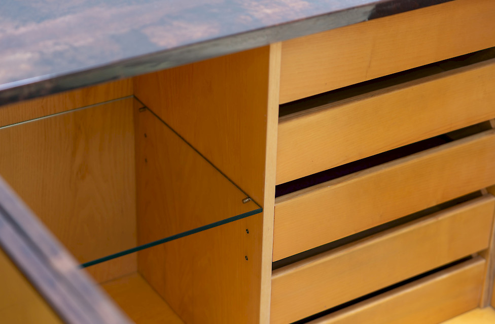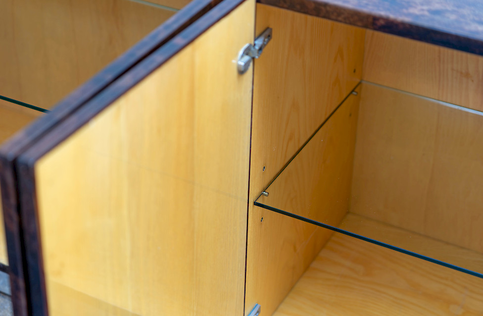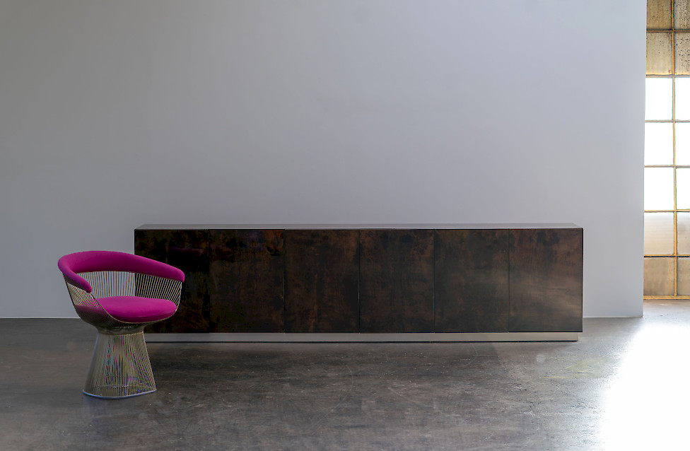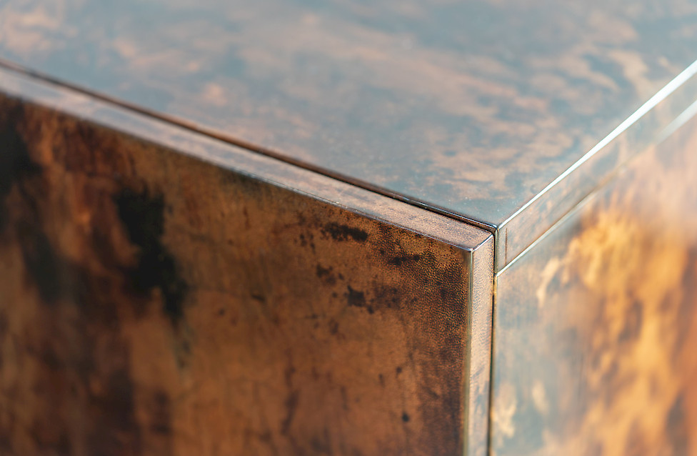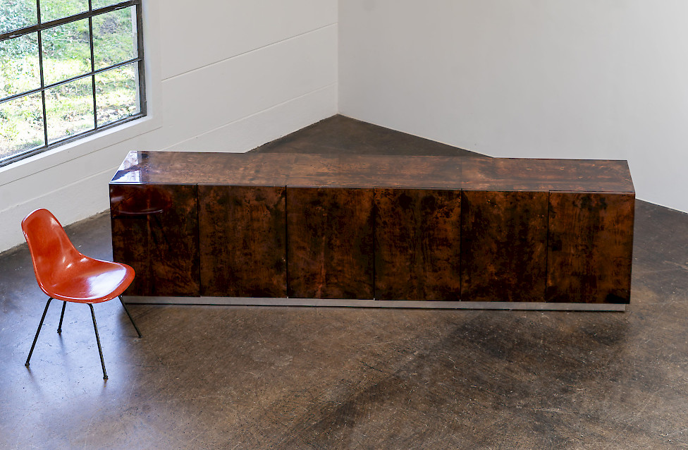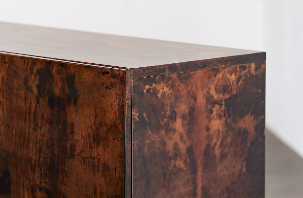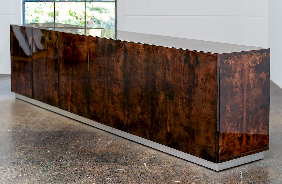 This striking sideboard combines high-gloss lacquered goatskin with a finely crafted metal base, reflecting the experimental material language of Italian design in the 1970s. The surface reveals a rich, nuanced palette ranging from deep brown to warm amber hues, constantly shifting with the light and giving the piece a dynamic visual character. The slender base creates a refined, graphic contrast to the organic quality of the skin and emphasizes the architectural clarity of the design. Six doors structure the expansive front, while the interior features a well-crafted wooden body fitted with glass shelves. Measuring an impressive 320 cm in width, this rare sideboard stands as a bold and sophisticated example of large-scale Italian furniture design.