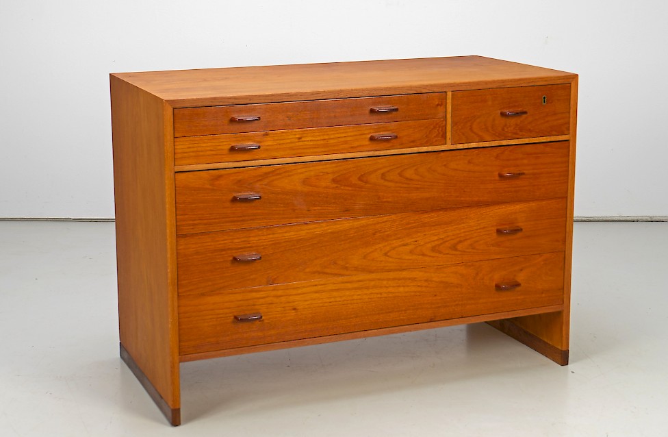 Chest of drawers by Hans J. Wegner, made in Denmark 1956. The body is made with oak and drawers are veneered with teak, on oak runners. Fully restored condition.
