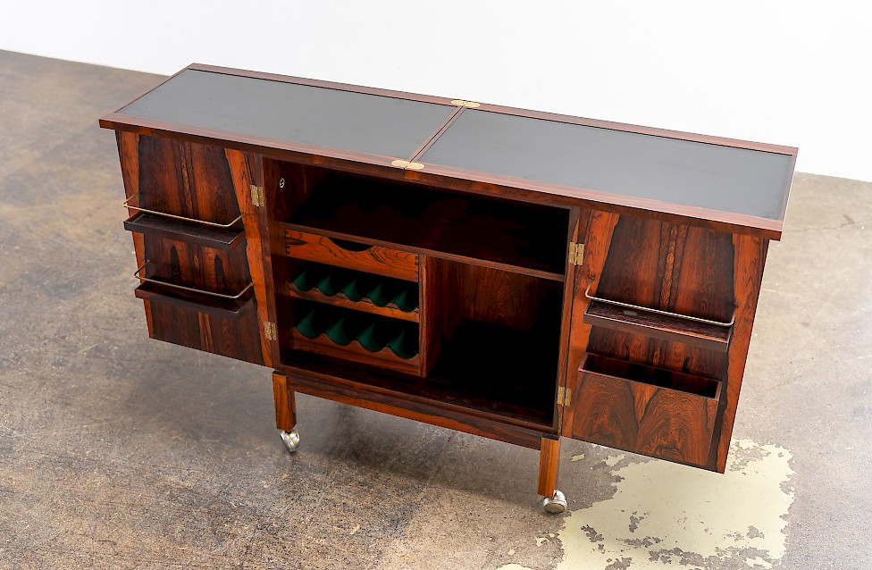 Designed for Bruksbo, this rare rosewood bar cabinet impresses with its fold-out top, brass hinges, and a well-considered interior featuring shelves, a green-lined bottle holder, and glass racks. Chrome castors provide mobility, while the locking system keeps the doors securely open or closed. A timeless collector’s piece from the 1960s, crafted by Mellemstrands Møbelfabrik. The bar cabinet comes with CITES documentation.