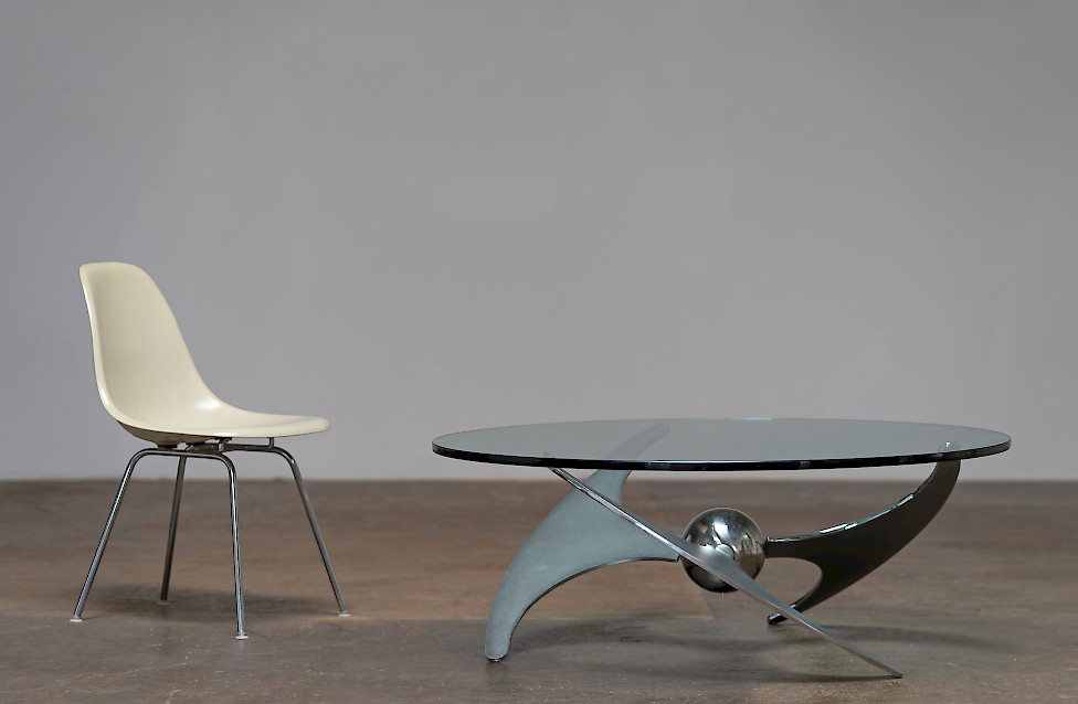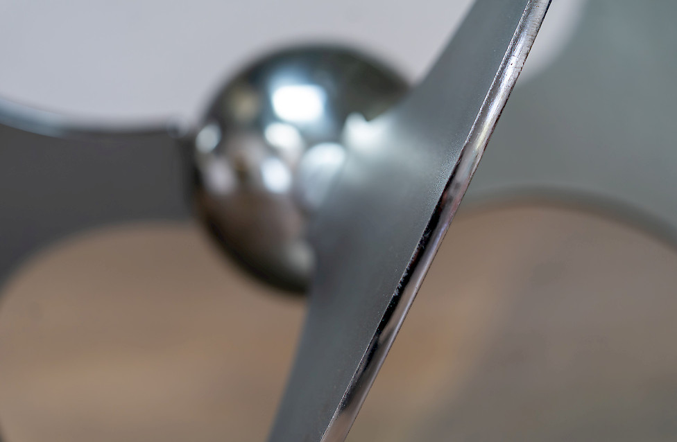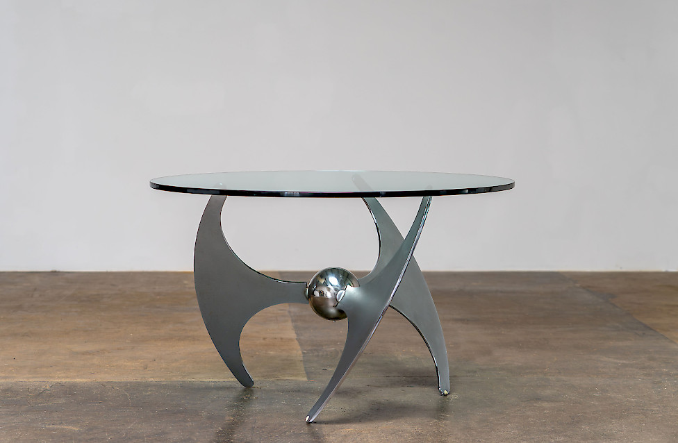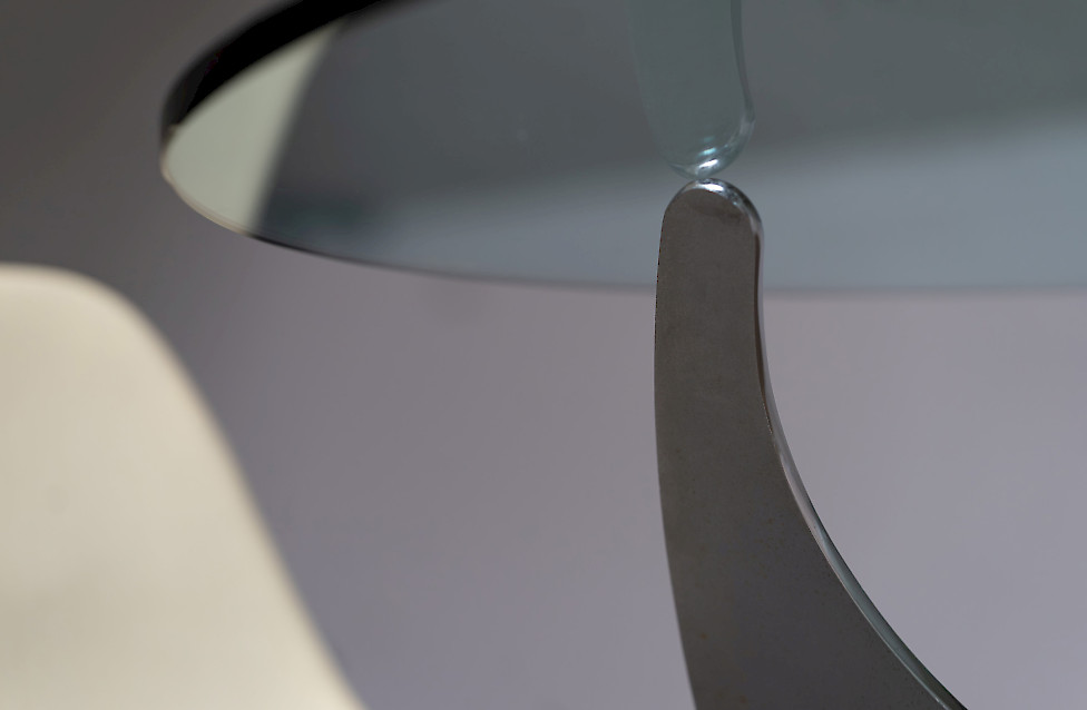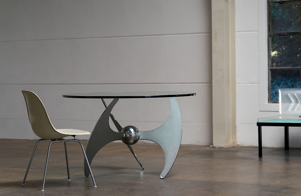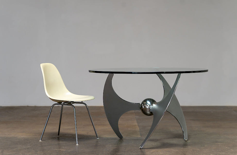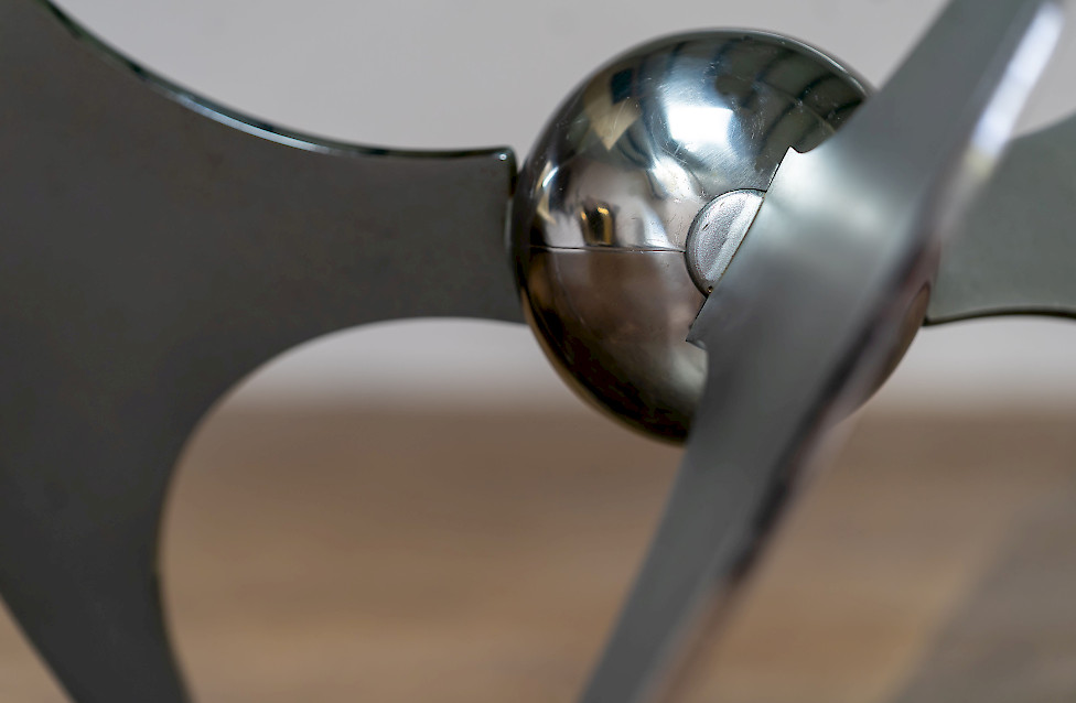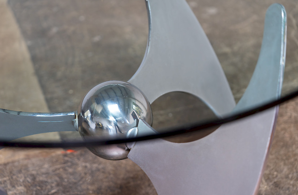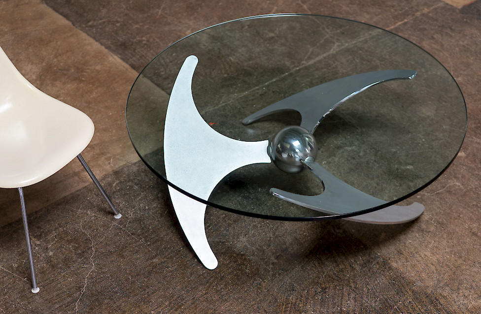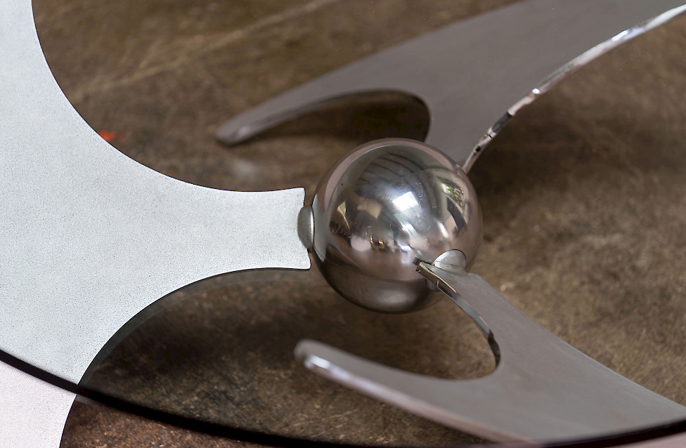 A striking Italian modernist table designed by Luciano Campanini for Cama in the 1970s. Often referred to as the “Elica” model, the piece is defined by its sculptural, aerodynamic base composed of curved steel elements intersecting around a polished central sphere. The dynamic, almost futuristic design allows the table to function equally well as a dining table or a low coffee table, depending on the setting.
