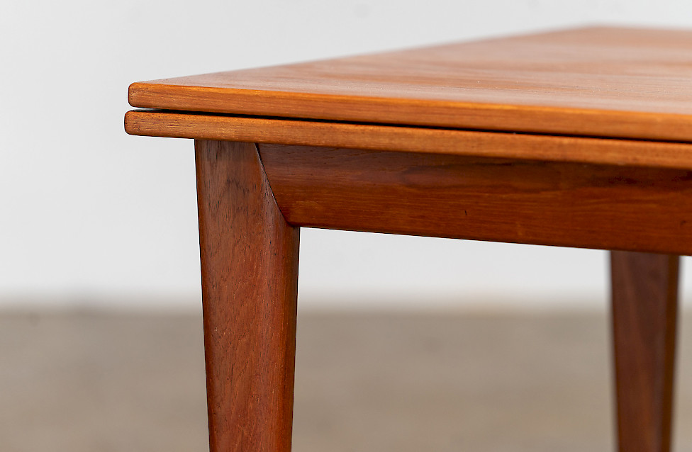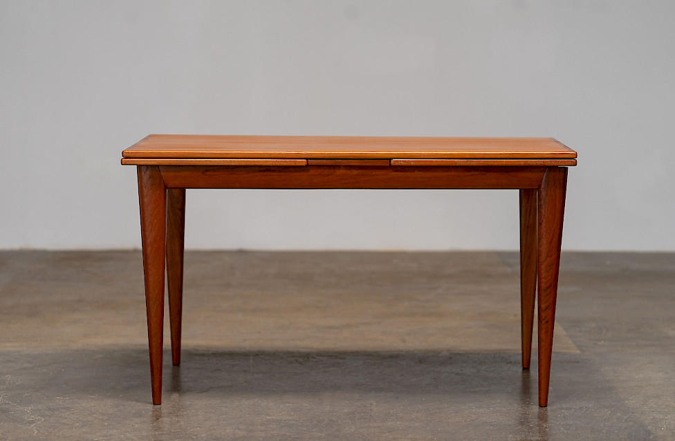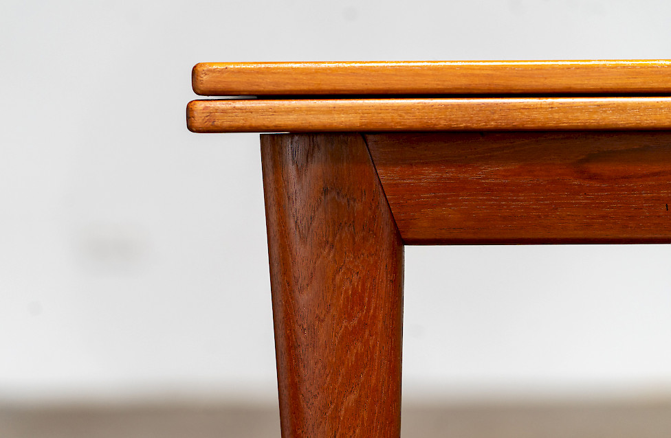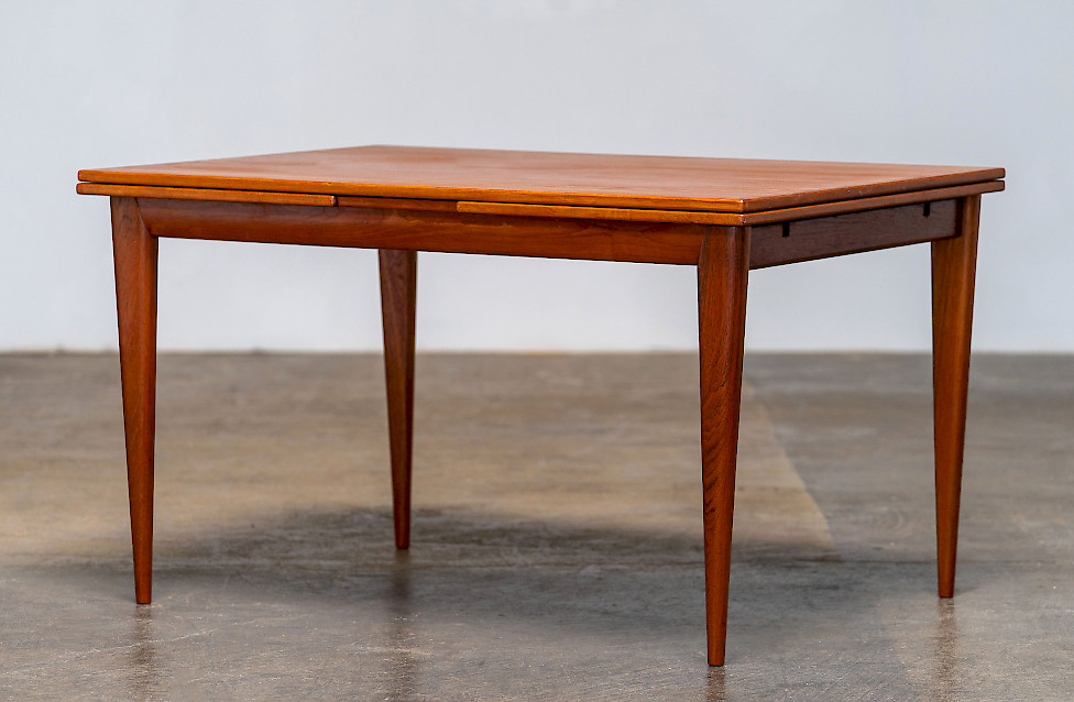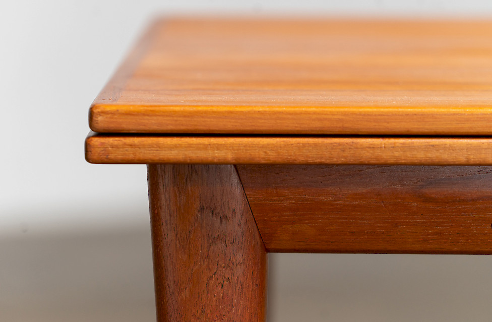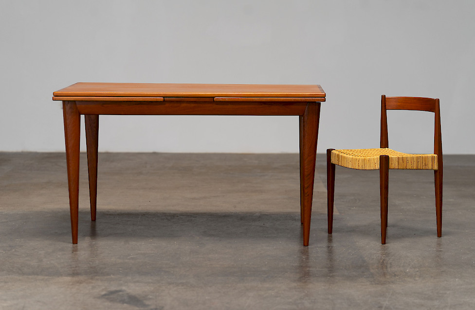 Timeless Danish design by Niels Otto Møller for J.L. Møllers Møbelfabrik: this extendable dining table from the 1960s stands out for its clean lines and exceptional craftsmanship. Made from fine teak wood, the surface displays a beautiful grain that continues seamlessly into the extension leaves. The table can be extended with one or two additional leaves. An original manufacturer’s label beneath the tabletop confirms its authenticity.