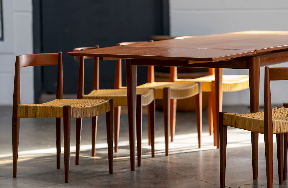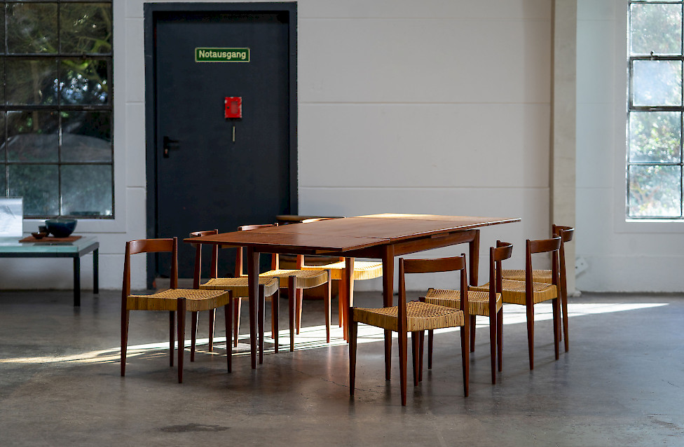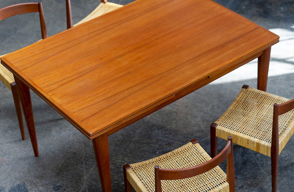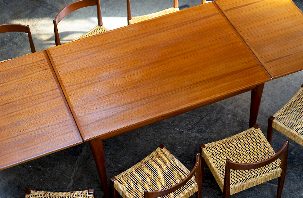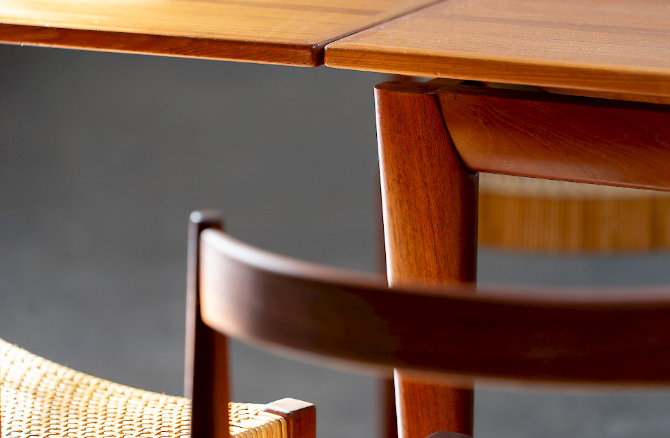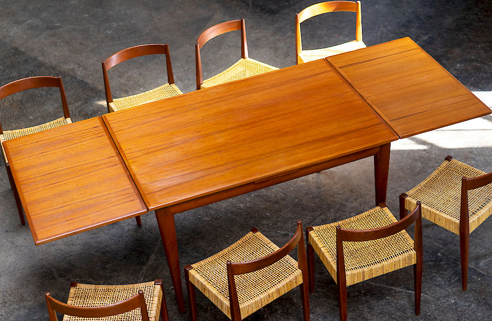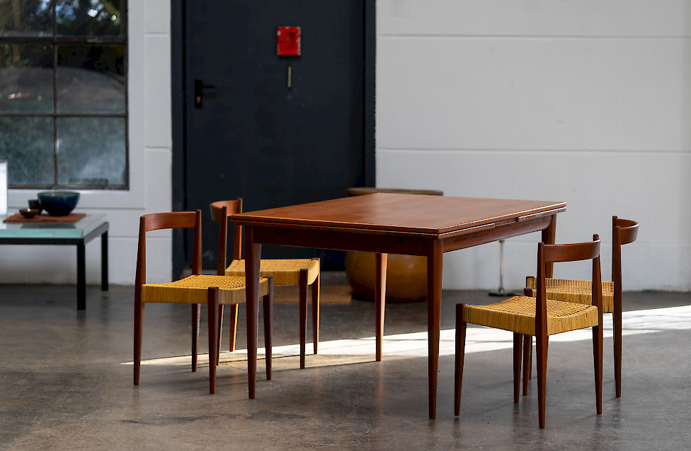 Timeless Danish design by Niels Otto Møller for J.L. Møllers Møbelfabrik: this extendable dining table from the 1960s stands out for its clean lines and exceptional craftsmanship. Made from fine teak wood, the surface displays a beautiful grain that continues seamlessly into the extension leaves. The table can be extended with one or two additional leaves. An original manufacturer’s label beneath the tabletop confirms its authenticity.